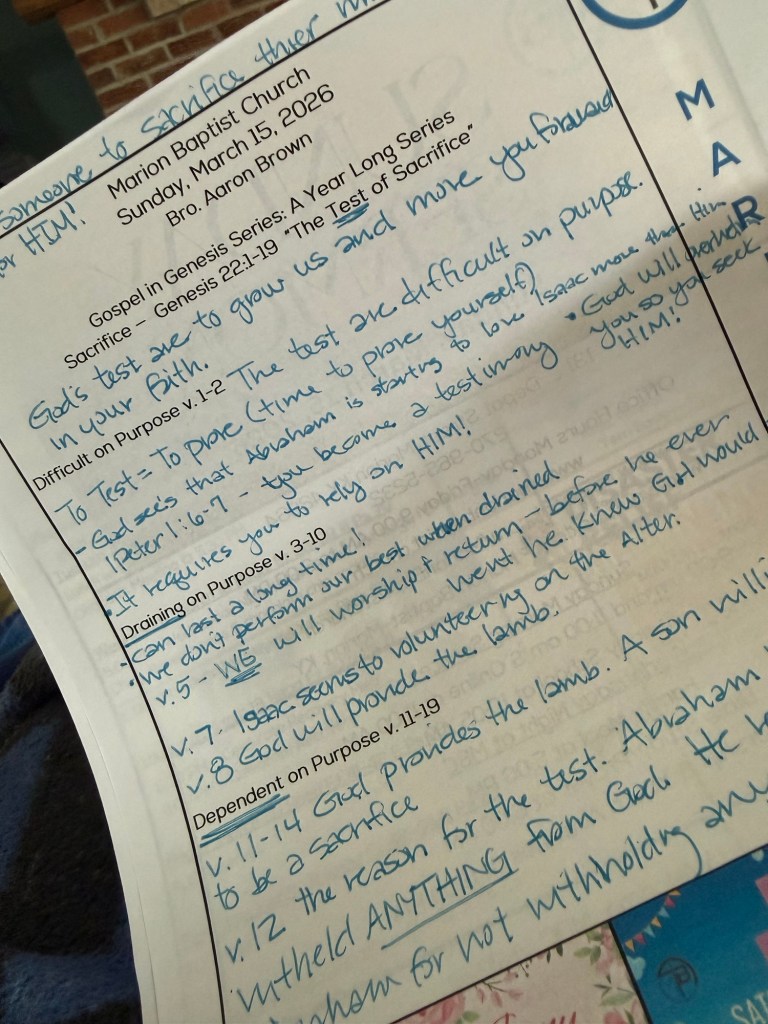 During church Aaron preached about the test of sacrifice. It was about God asking Abraham to sacrifice Isaac. He asked Abraham to sacrifice his most beloved thing (Isaac) for Him.